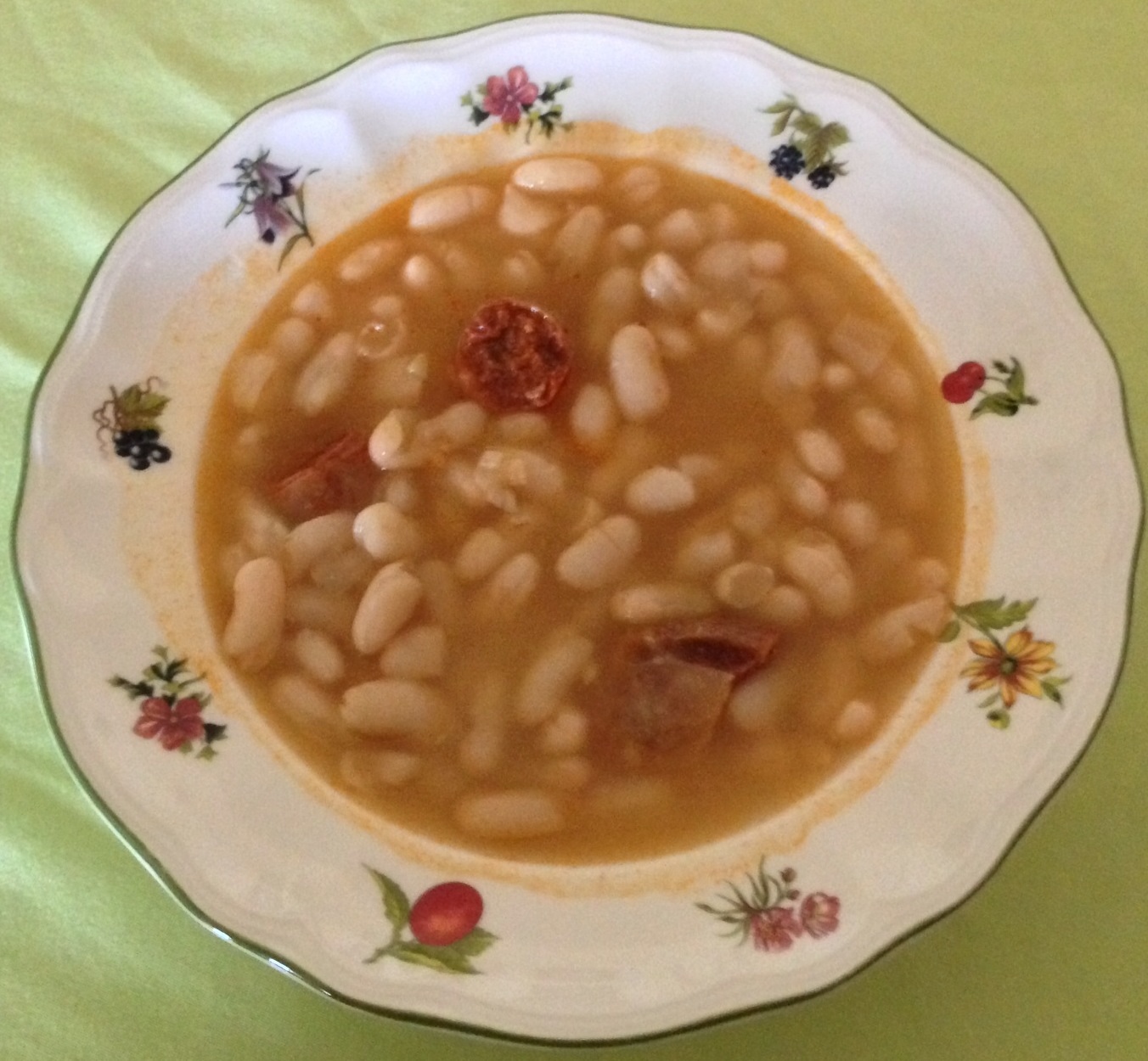 Repartimos las alubias en los platos poniendo 2 trozos de chorizo y uno de jamón a cada uno.
