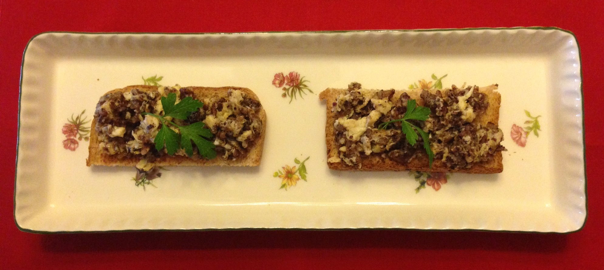 RECETAIngredientes: – 4 huevos – Media morcilla de arroz – 4 rebanadas de pan de molde – Aceite – Sal Preparación: Ponemos a tostar el pan de molde. Batimos los huevos con un poco de sal. Quitamos la piel a la morcilla y la desmenuzamos. En un sartén con poco aceite la freímos un par de minutos. Añadimos los huevos y removemos para hacer el revuelto poco tiempo, tiene que quedar jugoso y retiramos. Lo pasamos a un plato. Quitamos los bordes del pan y lo cortamos en rectángulos. Para montar el plato ponemos el revuelto por encima de cada rectángulo. Listo!! A disfrutar!!