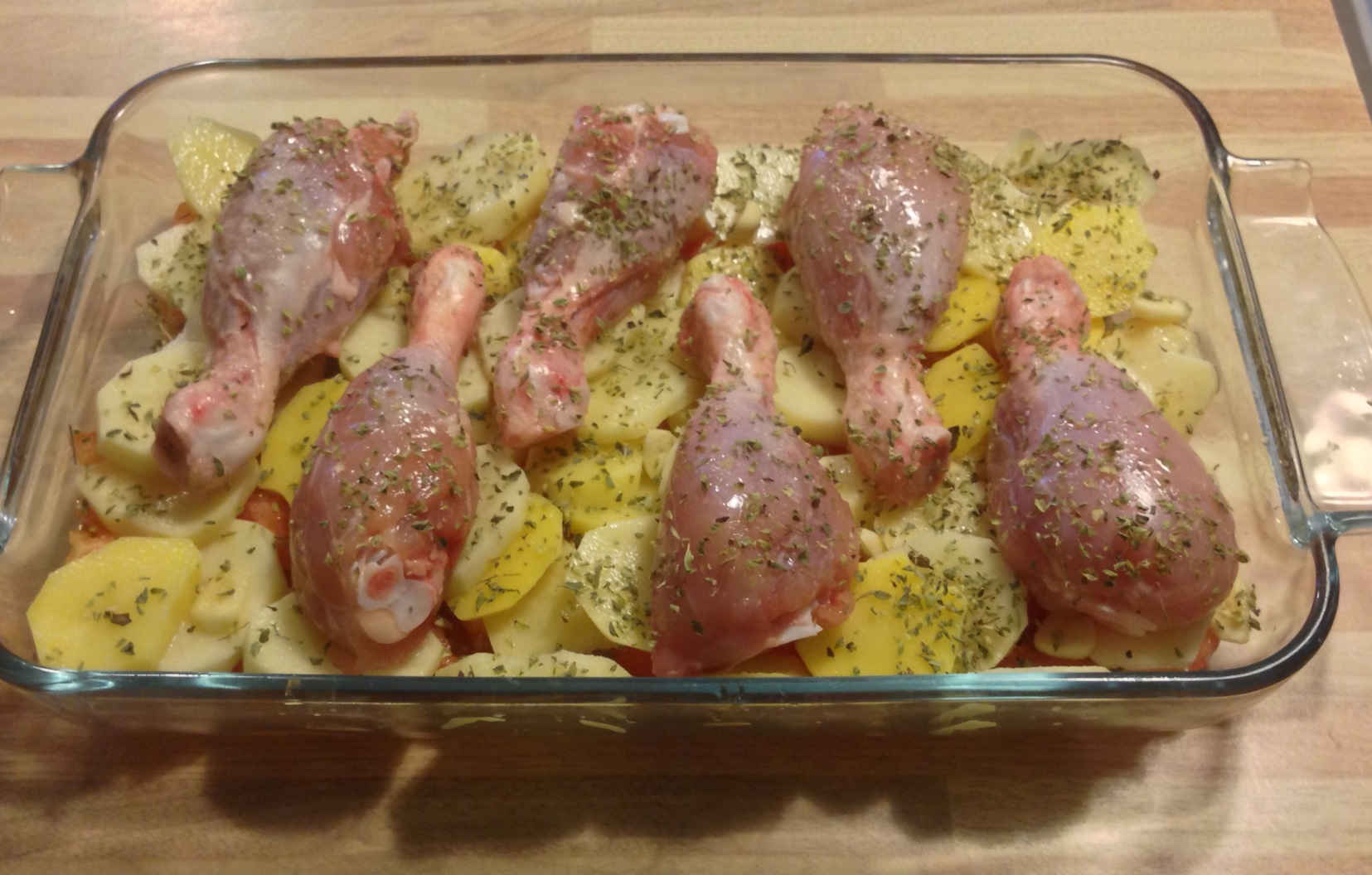 Ponemos encima los muslos de pollo con un poco de sal y orégano.