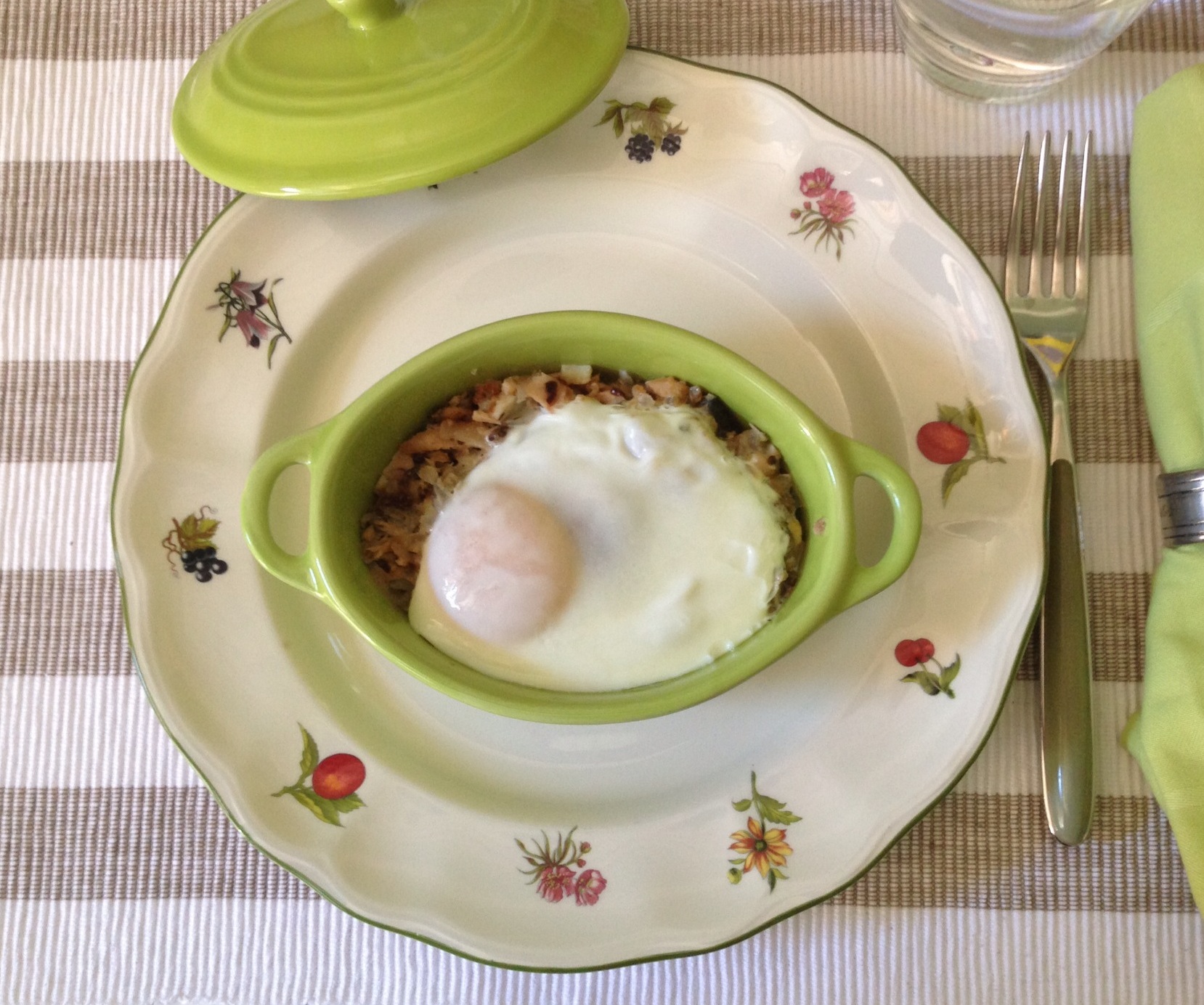 Ponemos esta mezcla, bien caliente, en las cocottes, cascamos un huevo en cada una y las metemos en el microondas a 360 w, durante 3 minutos y 20 segundos, cada una, hasta que el huevo esté cuajado con la yema líquida.