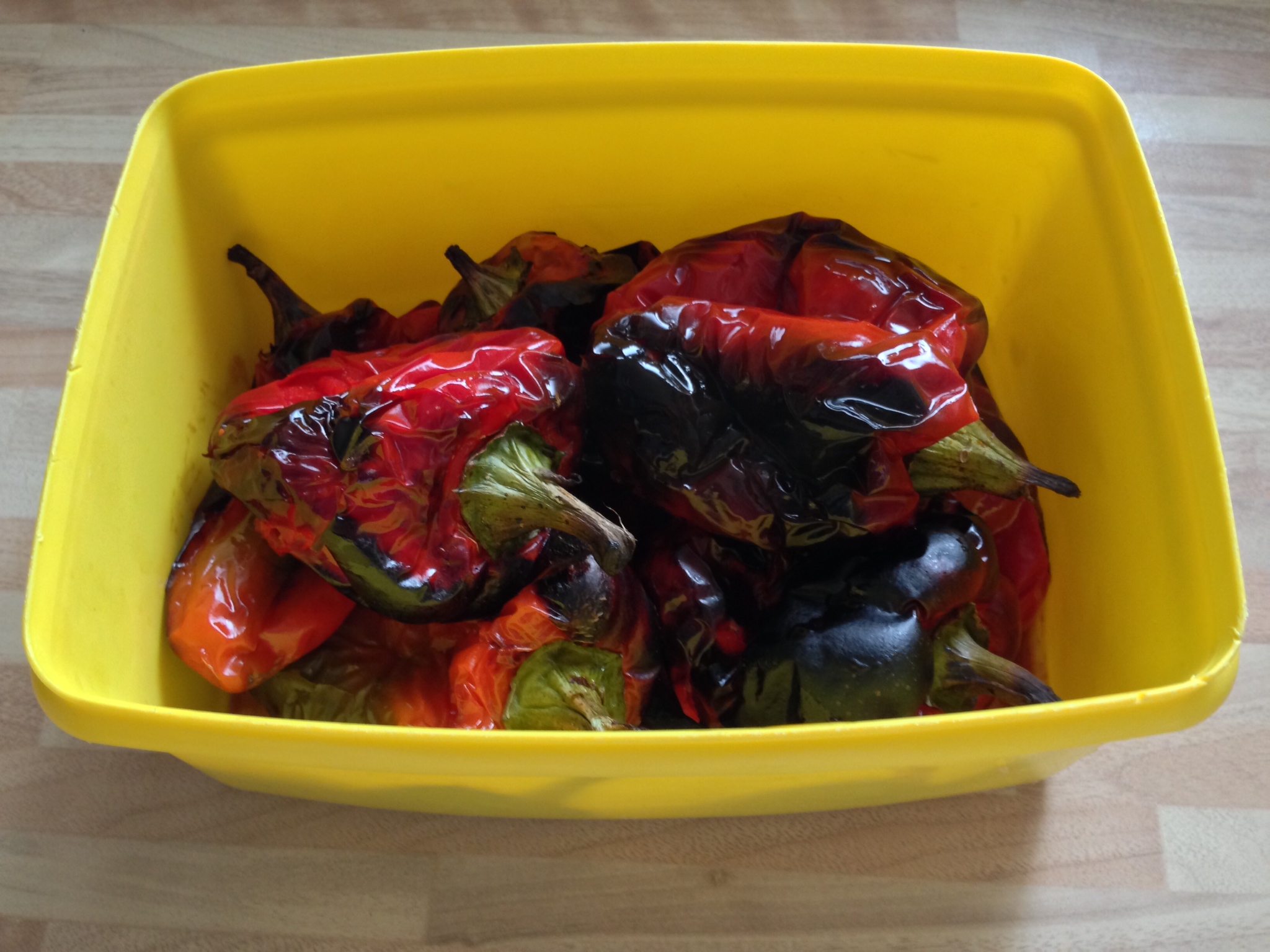 Una vez asados, los ponemos en un taper u otro recipiente que podamos cerrar herméticamente, dejándolos que «suden» hasta el día siguiente. Soltarán bastante jugo que reservaremos. Sacamos los pimientos, los pelamos y los cortamos en tiras. Es importante quitar todas las pepitas.