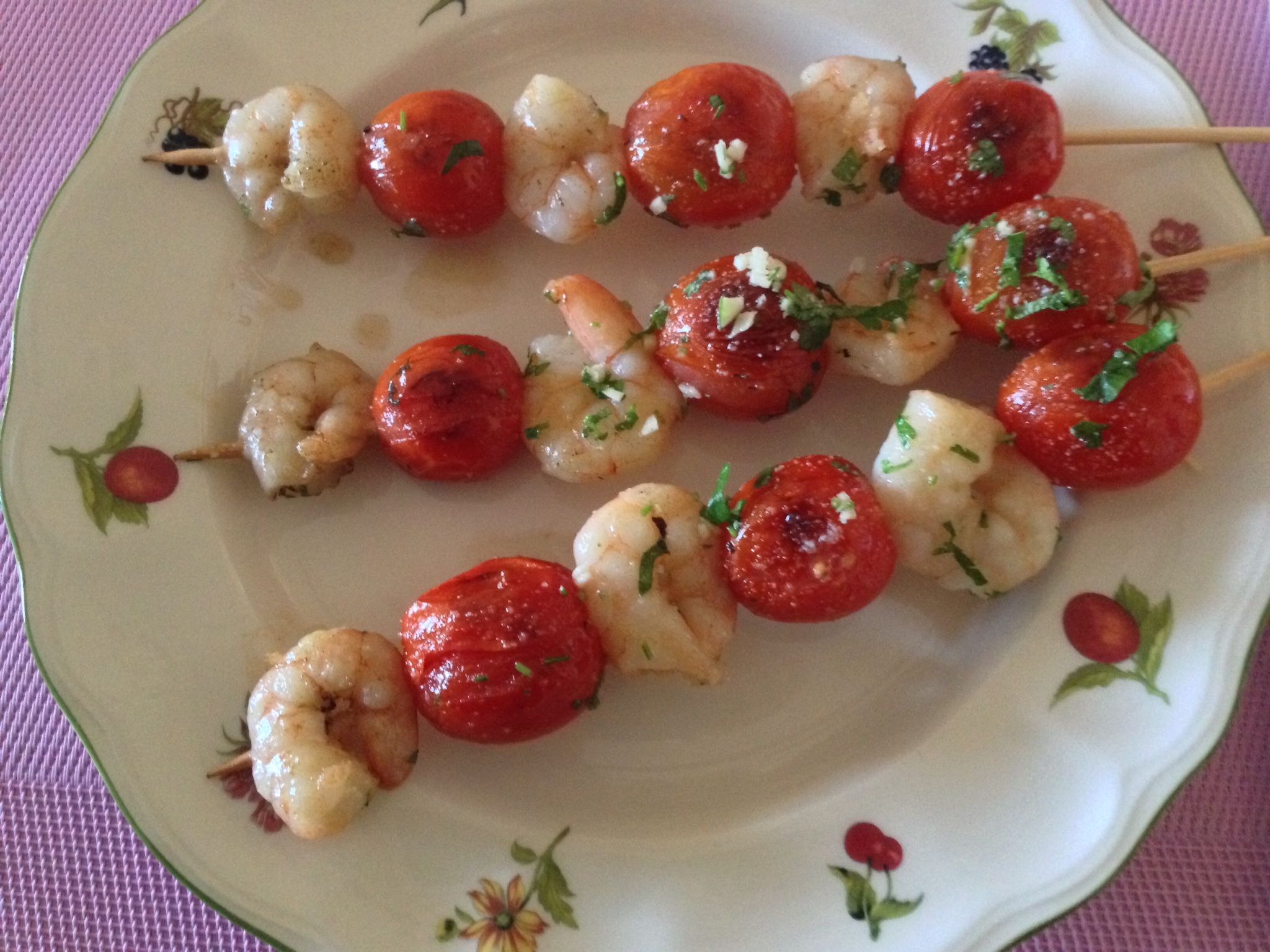 Ensartamos en cada brocheta 3 tomates y 3 gambas, alternándolos.