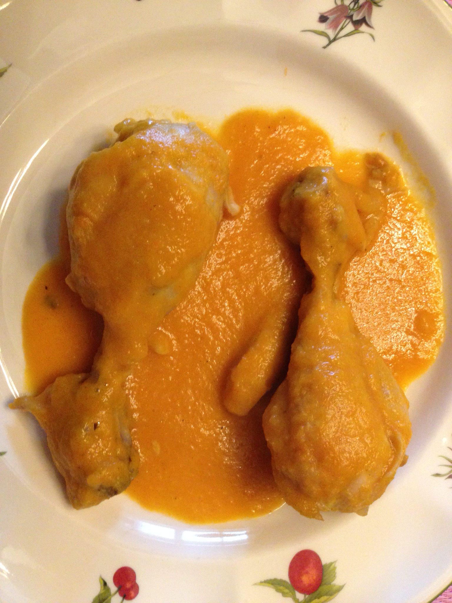 Pasado este tiempo retiramos los muslos de pollo, pasamos la salsa por la batidora. Una vez triturada la volvemos a poner en la cazuela junto con los muslos de pollo dejándolos cocer 5 minutos más a fuego lento.