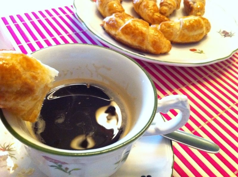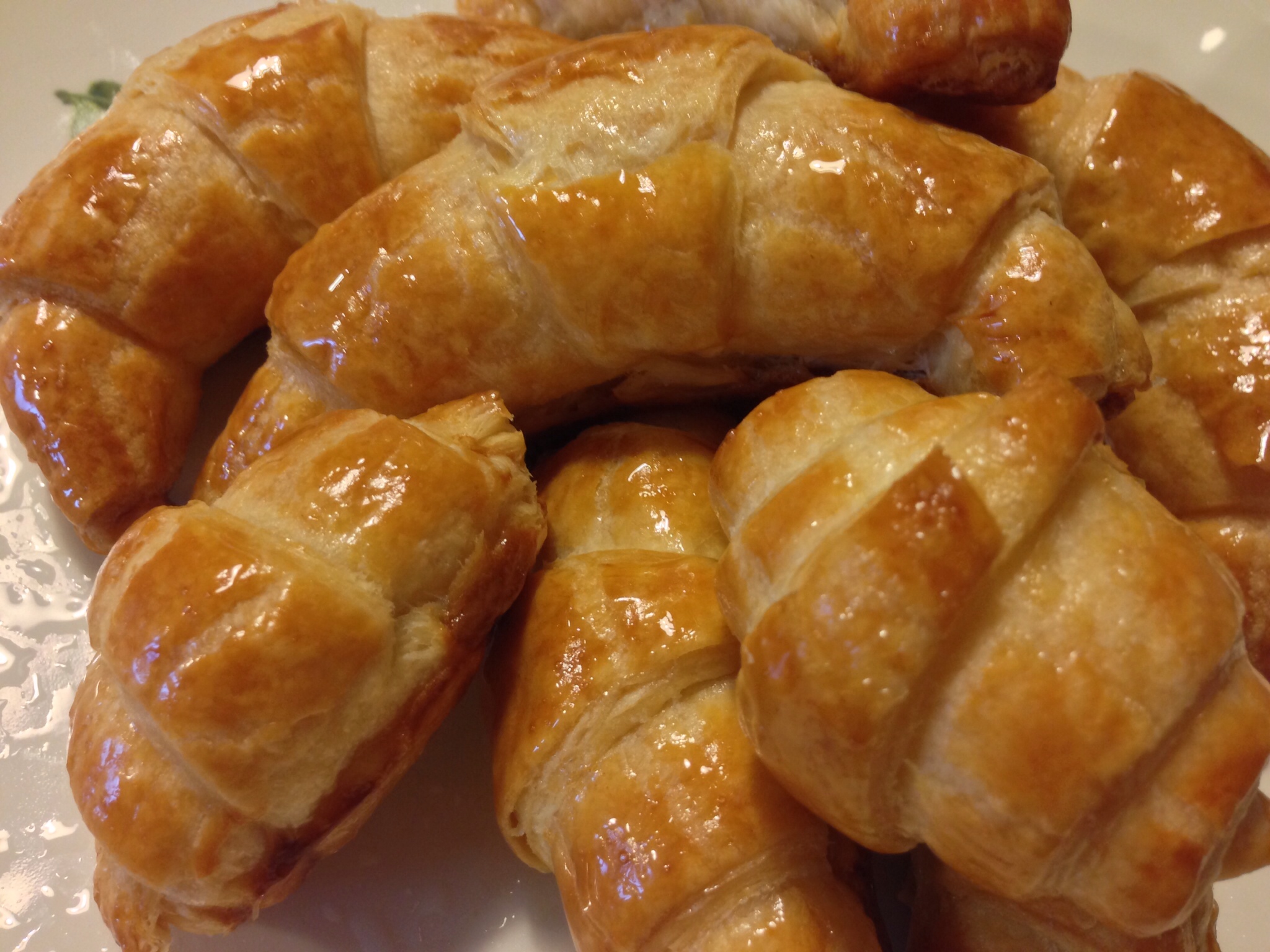 Extendemos la lámina de hojaldre y la cortamos por la mitad. Cada mitad la dividimos en 4 triángulos iguales. Enrollamos los triángulos desde la parte exterior hacia la punta y doblamos los extremos hacia delante, para que tenga forma de croissant. Batimos el huevo y con ayuda de un pincel untamos todos los croissants. Colocamos los croissants sobre una bandeja de horno con papel para hornear (si no tenemos papel, untamos la bandeja con un poco de mantequilla para que no se peguen). Horneamos los croissants con el horno precalentado a 175ºC unos 25-30 minutos, hasta que tengan un color dorado. Mientras, llevamos a ebullición el agua con el azúcar removiendo bien y reservamos. Cuando estén dorados los croissants los sacamos y con un ayuda de un pincel los pintamos con el almíbar, quedarán brilantes y apetitosos.