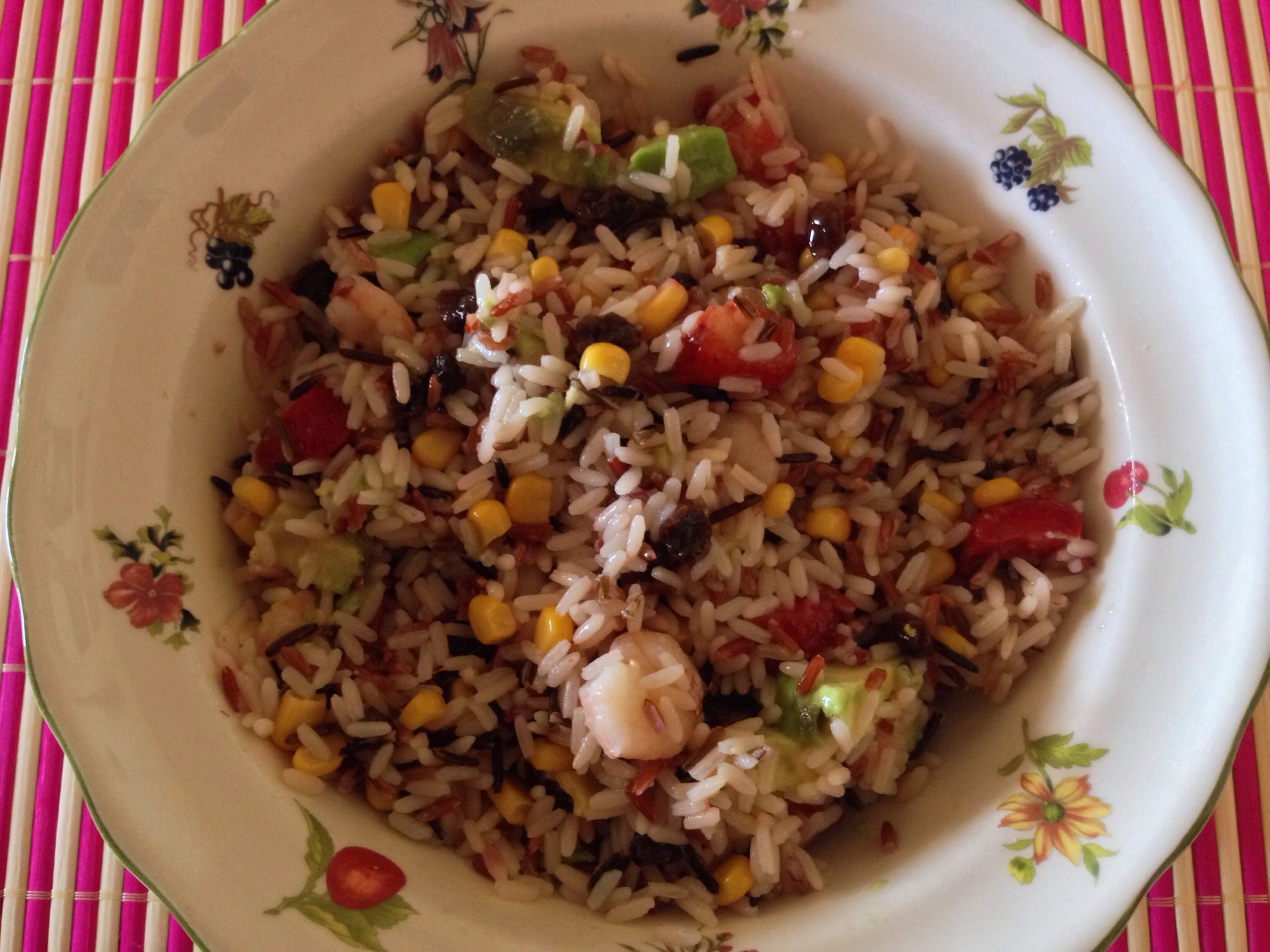 Esta ensalada la preparé con una mezcla de arroz largo, arroz salvaje ligeramente crujiente y arroz rojo integral comercializada de esta forma. Es una mezcla sorprendente y deliciosa.