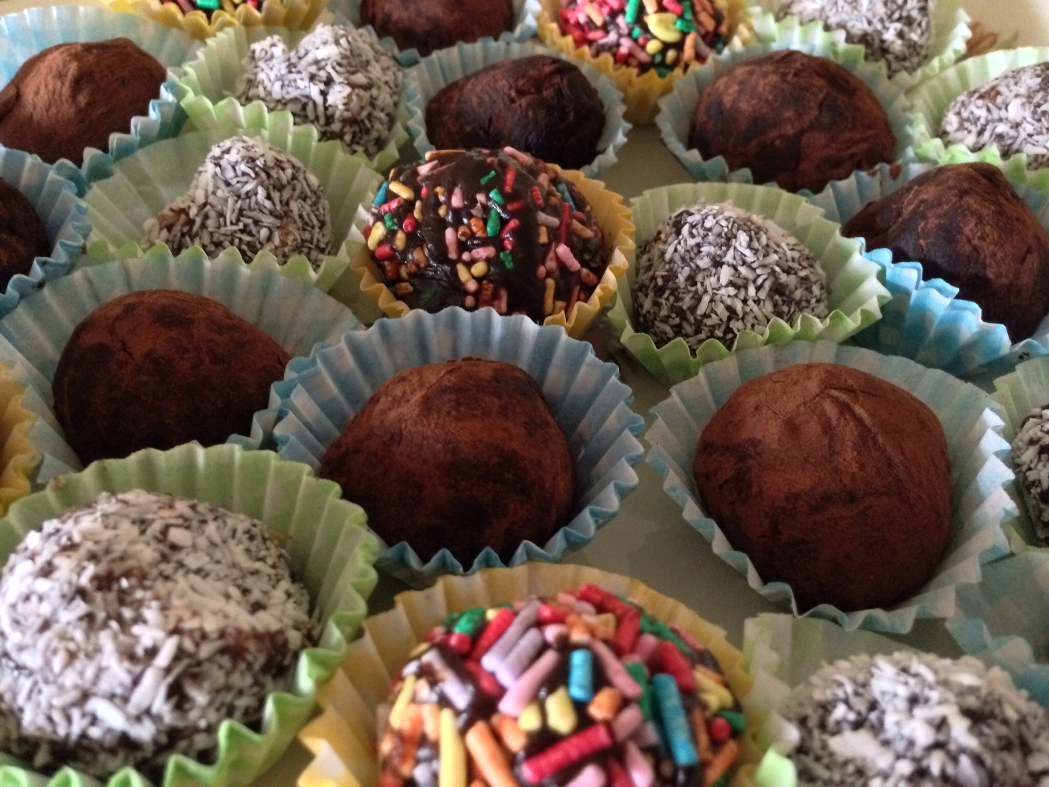 Pasado este tiempo, ayudándonos con dos cucharillas, formamos bolitas y las pasamos por cacao en polvo, coco rallado o fideos de colores.