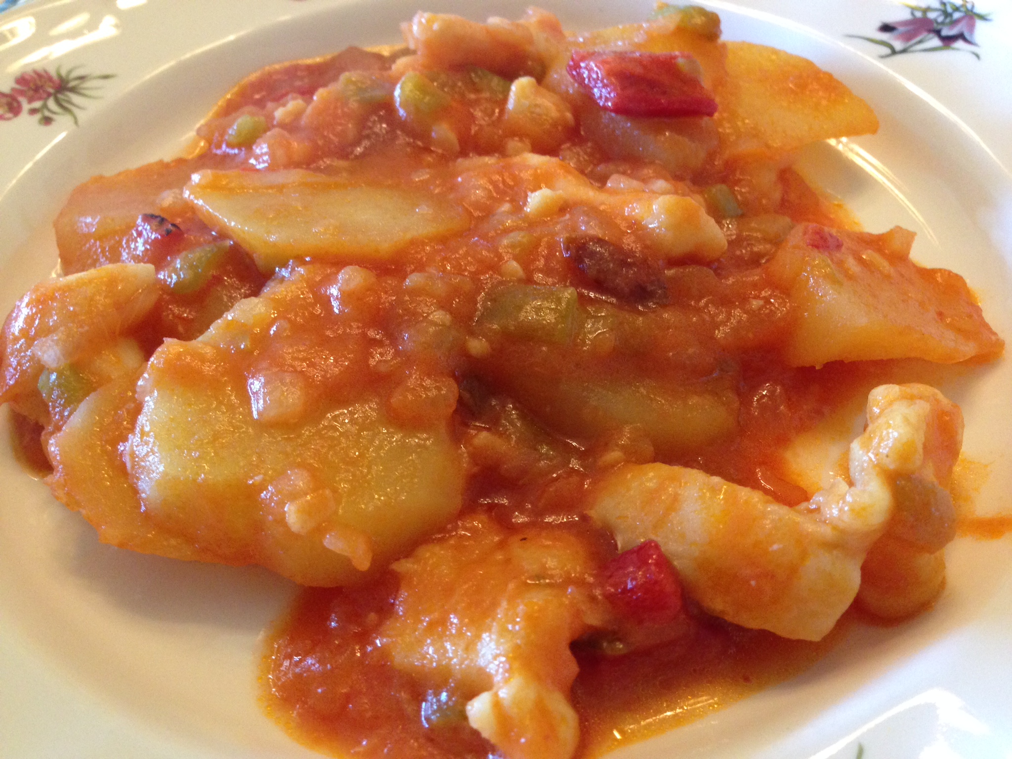 Lo sazonamos y dejamos que se rehogue a fuego medio, removiendo. Cuando la cebolla esté transparente, agregamos los pimientos y las guindillas. Lo freímos un poco más y añadimos el bacalado desmigado (si es congelado lo habremos descongelado previamente). Removemos y añadimos la salsa de tomate y lo dejamos cocer unos 15 minutos más hasta que las patatas estén tiernas y todo haya cogido el sabor del bacalao.