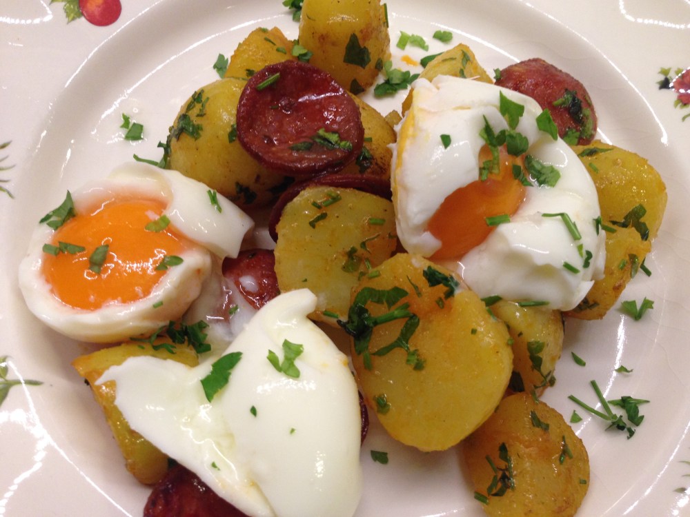 Huevos mollet con chorizo y patatas